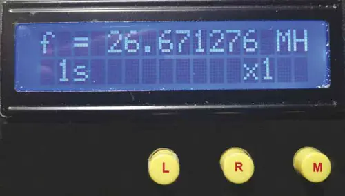 Информация об измеряемой частоте выводится в первой строке LCD-экрана, вторая строка - служебная. На ней отображаются настраиваемые параметры частотомера (пункты меню). Выбираем пункты меню с помощью кнопки "М".