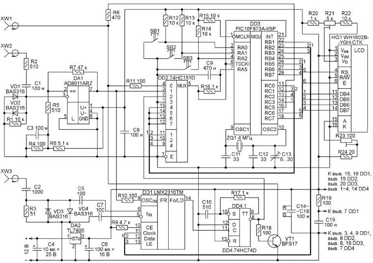 Предлагаемый частотомер содержит шесть микросхем - компаратор напряжения AD8611ARZ [1], синтезатор частоты LMX2316TM [2], D-триггер 74HC74D [3], селектор-мультиплексор 74HC151D [4], микроконтроллер PIC16F873A-1/SP [5] и интегральный стабилизатор напряжения TL7805. Результаты измерения он выводит на символьный ЖКИ WH1602B [6].