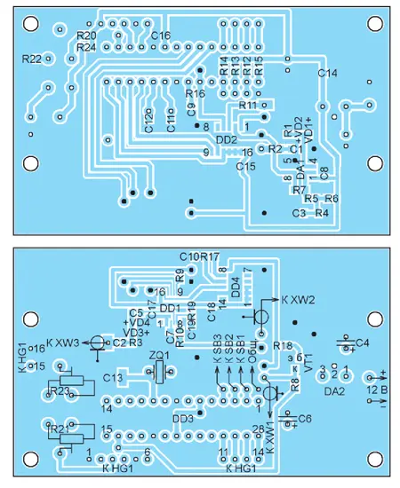 Чертёж печатной платы в формате Sprint Layout 5.0 и программу микроконтроллера можно скачать здесь.