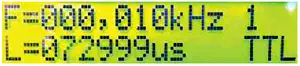 Для измерения частоты следования логических импульсов с уровнями ТТЛ кнопкой SB2 выбирают входной разъём XW1. Микроконтроллер формирует на выходах RC0-RC2 код 000, переводя этим селектор DD2 в состояние, при котором сигнал с разъёма XW1 поступает на входТОСК1 микроконтроллера для измерения частоты и на его же вход INT для измерения длительности импульсов. Результаты измерений программа выводит на ЖКИ HG1 (рис. 2), причём длительности импульсов высокого (H) и низкого (L) уровней на экране чередуются. Код в правой части верхней строки означает заданное время счёта: "10" - 10 с, "1" - 1 с, ",1" - 0,1 с и ",01" - 0,01 с. В правой части нижней строки выводится условное обозначение выбранного входного разъёма: TTL - XW1, VHF - XW2, UHF - XW3.