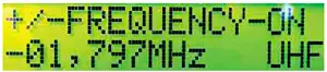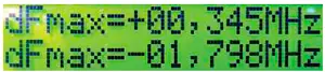 Чтобы измерить уход частоты, сигнал (в зависимости от его формы и частоты) подают на один из входных разъёмов XW1-XW3, выбирают кнопкой SB2 этот разъём, а кнопкой SB1 - функцию "+/-FREQUENCV (её название сопровождается меткой OFF). Измерение запускают нажатием на кнопку SB3, при этом метку OFF сменяет метка ON. Прибор измеряет уход частоты и выводит его текущее значение на ЖКИ (рис. 6). После повторного нажатия на кнопку SB3, останавливающего измерение, на ЖКИ появляются максимальные зафиксированные за время измерения значения ухода частоты вверх и вниз от исходной (рис. 7).