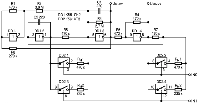 Схема генератора гармонических колебаний приведена на рис. 2. На элементах DD1.2-DD1.4 выполнен полосовой фильтр, на элементе DD1.1 - усилитель обратной связи и на элементах DD2.1-DD2.4 и RM - матрица сопротивлений с цифровым управлением. Структура фильтра позволяет получать на выходах противофазные напряжения, для чего необходимо использовать дополнительно Uвых2. Входы IN0 и IN 1 являются цифровыми входами управления частотой генерации.