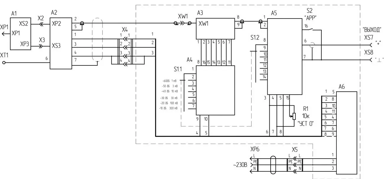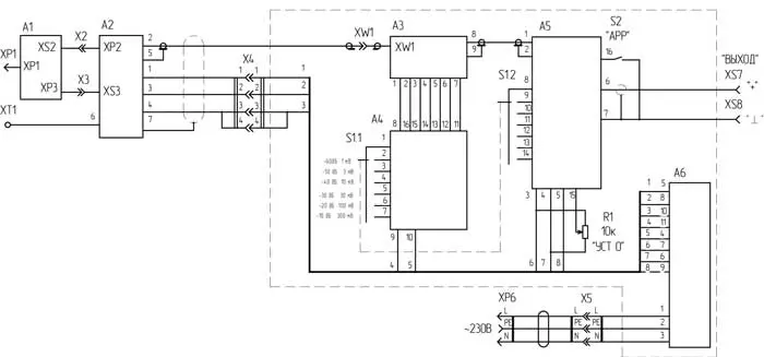 Схема электрическая принципиальная преобразователя А5 показана на рисунке 6, а схема его соединения с аттенюатором А3, секцией переключателя поддиапазонов S1.2, тумблером арретира S2, гнездами XS6,XS7переменным резистором установки нуля R1 и блоком питания А6 показана на рисунке 1.