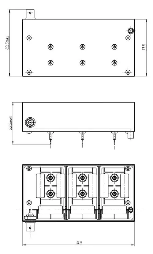 Корпус аттенюатора А3 (см. рис.12) изготовлен из двустороннего фольгированного стеклотекстолита толщиной 1,5 мм. Все стыки деталей корпуса соединяются пайкой по всей длине. Все детали аттенюатора смонтированы навесным монтажом. Аттенюатор крепится к левой стенке корпуса четырьмя винтами М3 через латунные спайсеры длиной 35 мм, при этом крышкой аттенюатора служит предварительно наклеенная на боковую стенку фольга. Расположение выходного кабеля РК50-3-111 (отверстие в дне аттенюатора имеет диаметр 3,5 мм) показано на рисунке. Оплетку экрана кабеля необходимо равномерно распределить по окружности и припаять изнутри.