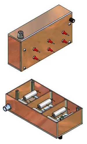Развязка по питанию реле обеспечивается проходными конденсаторами С2...С9. Все ступени полностью экранированы. Высокочастотная розетка XW1 установлена в пространстве ступени ослабления -10 дБ, а ее соединительная часть проходит через отверстие в лицевой панели прибора.