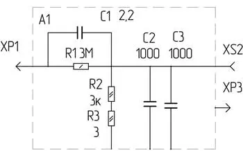 Схема электрическая принципиальная делителя напряжения А1 показана на рисунке 2, а схема его соединения с пробником А2 показана на рисунке 1.