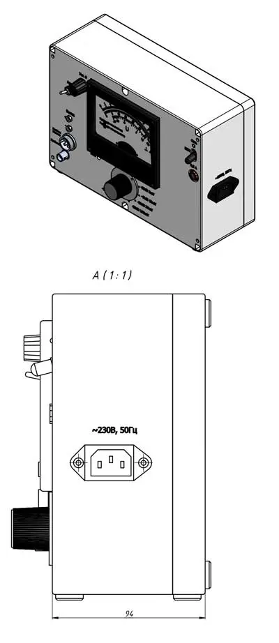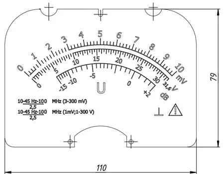 Микроамперметр РА1 – М906 0...100 мкА, с окном трапецеидальной формы. Необходимо изготовить новую шкалу прибора (см. рис. 20). Возможно изготовление шкалы на оборотной стороне штатной алюминиевой шкалы прибора методом металлографики или с применением виниловой наклейки. Нужно обратить внимание на условное обозначение расположения шкалы (на рисунке 17 (см. архив ниже) – вертикальное, наиболее распространенное), и при необходимости его изменить.