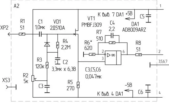 Схема электрическая принципиальная выносного пробника А2 показана на рисунке 3, а схема его соединения с делителем А1, аттенюатором А3 и блоком питания А6 показана на рисунке 1.