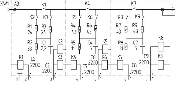 Аттенюатор А3 включает в себя 3 ступени ослабления – одна ступень -10 дБ, и две ступени -20 дБ. Коммутация ступеней производится высокочастотными герконовыми реле К1...К9.