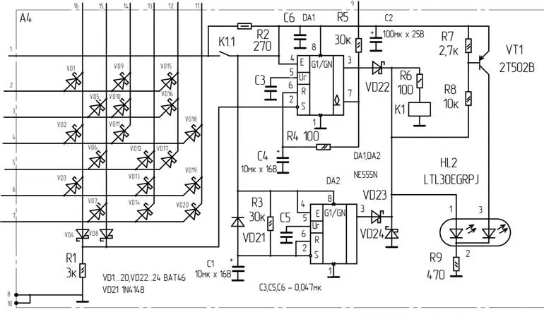 Одновибратор на таймере DA1 [3] срабатывает при понижении напряжения на резисторе R1 и выводе 2 ниже 2/3 напряжения питания таймера. Резистор R1 и вывод 2 DA1 подключены к диодной матрице через диоды VD4 и VD8 так, что при любом переключении S1 напряжение на резисторе R1 падает. Одновибратор, срабатывающий при включении питания на таймере DA2 [3], обеспечивает первоначальное срабатывание реле аттенюатора без необходимости переключения S1. Индикатором состояния реле аттенюатора А3 служит двухцветный светодиод HL1. При обесточенном реле К1 через открытый транзистор VT1 включается элемент HL1 зеленого цвета свечения. При включенном реле К1 кратковременно включается элемент HL1 красного цвета свечения, при этом транзистор VT1 закрывается, и элемент HL1 зеленого цвета свечения гаснет.