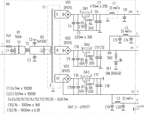 Блок питания А6 построен на основе силового трансформатора Т1 с тремя вторичными обмотками и линейных регулируемых стабилизаторов DA1...3. Трансформатор экранирован ферромагнитным экраном и имеет экранирующую обмотку. Сетевое напряжение на первичную обмотку поступает через фильтр на трансформаторе Т2 и конденсаторах С1...3. Защита первичной обмотки Т1 от перенапряжения в питающей сети обеспечивается варистором R2 и предохранителем FU1.