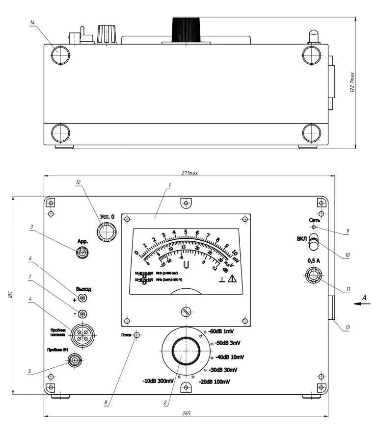 Базовая часть милливольтметра смонтирована в пластиковом корпусе G378 с размерами 185 мм х 265 мм х 95 мм производства GAINTA INDUSTRIES LTD (см. рис.8). Вся внутренняя поверхность корпуса и крышки после изготовления всех необходимых отверстий оклеивается изнутри алюминиевой фольгой с клеевой основой или медной фольгой при помощи двустороннего скотча. Необходимо предварительно убедиться в электропроводности фольги, если она была изготовлена напылением. Все фрагменты фольги (если не использовалась целая выкройка) должны быть надежно электрически соединены между собой. Экран корпуса электрически соединяется с контактом 2 X5 - PE. Экран крышки гибким монтажным проводом длиной не менее 150 мм также соединяется с контактом 2 X5. На лицевой стороне размещены микроамперметр PA1 (рис.8, поз.1), переключатель поддиапазонов измерения S1 (рис.8, поз.2), тумблер арретира S2 (рис.8, поз.3), разъем питания пробника X4 (рис.8, поз.4), высокочастотная розетка XW1 (рис.8, поз.5), гнезда внешнего вольтметра XS7,XS8 (рис.8, поз.6 и 7), отверстия светодиодов A4-HL1 (рис.8, поз.8) и A6-HL1 (рис.8, поз.9), отверстие под тумблер блока питания A6-S1 (рис.8, поз.10), отверстие под предохранитель FU1(рис.8, поз.11), и переменный резистор R1 (рис.8, поз.12). На боковой стороне корпуса расположен разъем сетевого питания XP5 (рис.8, поз.13). На нижней боковой стенке корпуса и на крышке прибора установлены опорные ножки (рис.8, поз.14).Таким образом, прибор можно установить как на нижнюю сторону корпуса, так и на крышку.