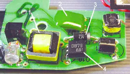 В качестве донора был выбран плёночный фотоаппарат Konica с системами автофокусировки, автоматического определения выдержки и др. Желательно проверить, исправна ли у него фотовспышка; если это так, то исправен и повышающий преобразователь напряжения. Элементы преобразователя напряжения размещены на обратной стороне печатной платы, расположенной рядом с окном для газоразрядной импульсной лампы (рис. 1). Для изготовления преобразователя потребуются малогабаритный импульсный повышающий трансформатор 1, быстродействующий выпрямительный диод 3 [5], транзистор 4 и конденсатор 2 на номинальное напряжение 400 В. Несколько слов о транзисторе, который применён в преобразователе, в данном случае это 2SD879 [6]. Этот транзистор предназначен специально для работы в импульсных устройствах с малым напряжением питания, он обладает большим коэффициентом передачи токаи малым напряжением насыщения, что важно при напряжении источника питания 1...1,5 В.