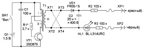 Схема пробника показана на рис. 2. На транзисторе VT1 и трансформаторе Т1 собран блокинг-генератор. Она соответствует схеме преобразователя в фотоаппарате. Трансформатор содержит первичную обмотку II, обмотку обратной связи I и вторичную повышающую обмотку III. После подачи питающего напряжения блокинг-генератор начинает работать, и импульсы напряжения на вторичной обмотке выпрямляет диод VD1, конденсатор С2 сглаживает пульсации выпрямленного напряжения, резисторы R2 и R3 ограничивают выходной ток преобразователя до безопасного значения (около 1 мА). Диод HL1 служит индикатором наличия выходного тока.