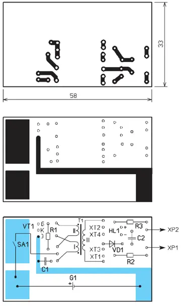 Для корпуса пробника был выбран контейнер размерами 62x37x14 мм от драже Tic-Tac. Печатная плата рассчитана для установки в этот корпус. Изготовлена она из фольгированного с двух сторон стеклотекстолита толщиной 1 мм, чертёж которой показан на рис. 3. Применены резисторы МЛТ, С2-23, конденсатор С1 - плёночный или керамический. Светодиод - любого свечения сверхъяркий с диаметром корпуса 3 мм. Выключатель - ПД9-2 или импортный аналогичной конструкции. Источник питания - гальванический элемент типоразмера ААА. Остальные детали - от фотоаппарата, их надо демонтировать с его платы. После выпаивания импульсного трансформатора, а делать это надо в первую очередь и очень аккуратно, следует уточнить схему его подключения к транзистору, к выпрямительному диоду и определить обмотки и назначение их выводов.