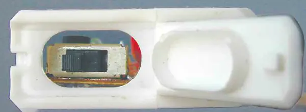 Корпус выключателя припаян к металлизированной площадке на плате так, чтобы при открывании клапана контейнера был доступ к движку выключателя (рис. 4). Такая конструкция исключает случайное включение пробника. Импульсный трансформатор закреплён на плате с помощью термоклея, а его выводы соединены с печатными проводниками платы отрезками провода. Это сделано специально для того, чтобы было можно оперативно изменять варианты подключения трансформатора, а также применить трансформатор другой конструкции или размера.
