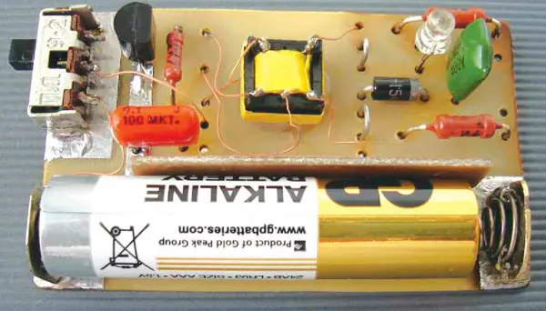 Конечно, такие матрицы можно проверить, подключая их непосредственно к сети 230 В, но это небезопасно, да и сеть может оказаться труднодоступной. В этом случае пригодится пробник с автономным питанием, выходное напряжение которого было бы достаточно для проверки светодиодных матриц с сетевым питанием. Такой пробник должен содержать высоковольтный преобразователь напряжения, который с целью упрощения схемы целесообразно собрать на одном транзисторе, а для питания удобно использовать гальванические элементы типоразмера ААА. Но в этом случае потребуется повышающий импульсный трансформатор, да и транзистор подойдёт не любой.