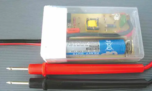 Выходное напряжение при напряжении питания 1,6 В (новый элемент питания) - 270 В (при нулевом выходном токе), потребляемый ток - около 40 мА, при замыкании выводов щупа ток увеличивался до 100 мА.