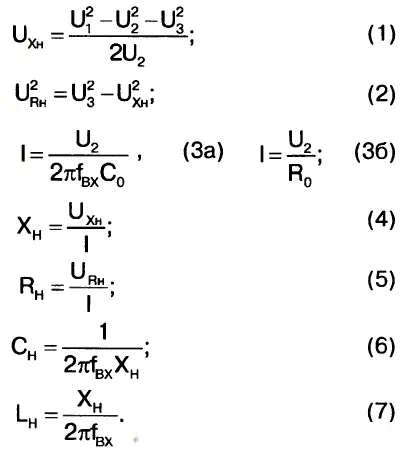 При известных значениях образцового сопротивления R0 или ёмкости С0, а также частоты входного сигнала fBX погрешность измерения комплексного сопротивления определяется погрешностью измерения напряжений U1-U3. Для повышения точности нужно следить за постоянством напряжения U1 и частоты сигнала, а сопротивление образцового элемента (R0, Со) не должно существенно отличаться от ожидаемого сопротивления нагрузки. Если импеданс нагрузки заранее неизвестен, устанавливают образцовый резистор R0 сопротивлением 50... 100 Ом и проводят измерения. При различии напряжений U2 и U3 более чем в два раза в соответствующую сторону изменяют сопросопротивления (импеданса) на основе делителя напряжения и трёх вольтметров известны. В частности, их применяют радиолюбители для измерения электрических параметров антенн [1]. Упрощённая схема такого прибора показана на рис. 1. К источнику переменного напряжения последовательно подключают исследуемое комплексное сопротивление (RH, Сн) и известное (образцовое) реактивное ёмкостное С0или активное сопротивление R0.