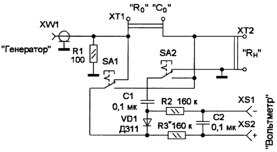 Все детали монтируют в пластмассовом корпусе размерами 30x80x120 мм. Входное ВЧ гнездо XW1 (BNC-124) размещают на одной из боковых сторон, гнёзда для подключения нагрузки (клеммники нажимные РТ-213-03, РТ-224-01) - на соседней, переключатели - П2К с возвратом повторным нажатием и гнёзда для подключения образцовых элементов (РТ-213-03, РТ-224-01) - на верхней. Все указанные элементы следует расположить как можно ближе друг к другу. Диод VD1 и конденсатор С1 монтируют на выводах переключателей. Гнёзда XS1, XS2 могут быть любого типа, их размещают на свободной стенке корпуса, на них устанавливают конденсатор С2. Резисторы R2 и R3 припаивают между выводами переключателей и гнёздами XS1, XS2.