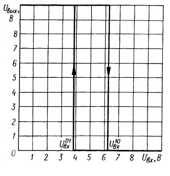 Вторая особенность - наличие гистерезиса выходного напряжения при переключении, что повышает помехоустойчивость работы триггера Шмитта при входном сигнале, содержащем помехи значительного уровня.