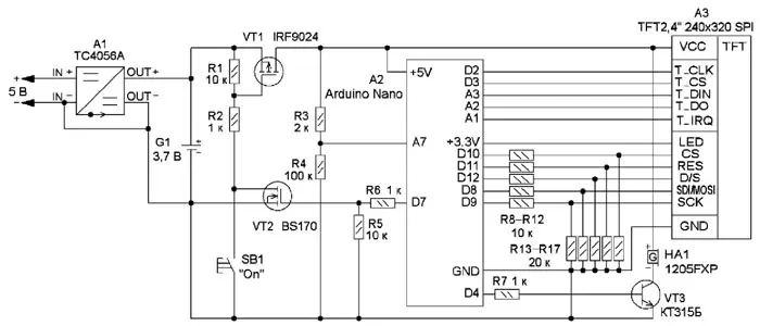 С помощью делителя напряжения на резисторах R3 и R4 модуль A2 измеряет напряжение аккумулятора. Если оно снизится до 3,3 В, цвет цифр на дисплее сменится на жёлтый, а при снижении напряжения аккумулятора до 3 В и менее - на красный, и устройство издаёт короткий звуковой сигнал раз в минуту. При снижении напряжения аккумулятора ниже 2,5 В устройство отключается. Питается таймер от Li-Ion аккумулятора G1, и напряжения разряженного аккумулятора 3 В хватает для нормальной работы таймера. Заряжается аккумулятор через модуль А1 на микросхеме ТС4056А с помощью зарядного устройства от мобильного телефона с выходным напряжением 5 В.