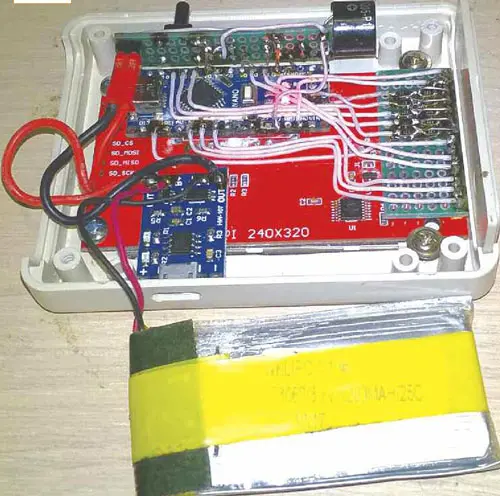 Расположение элементов таймера в пластмассовом корпусе показано на рис. 4. В передней крышке корпуса резаком, сделанным из ножовочного полотна по металлу, вырезают отверстие размерами 60x43 мм, в которое вставляется дисплей, а затем закрепляется четырьмя винтами М3. С платы дисплея удаляют разъём для подключения SD-карты, а на её место с помощью двухсторонней липкой ленты закрепляют модуль Arduino Nano. На первой макетной плате, которая закреплена в верхней части корпуса, монтируют кнопку SB1, транзисторы VT1-VT3, акустический излучатель НА1 (см. рис. 3). На второй макетной плате устанавливают резисторы преобразователей уровня и припаивают выводы дисплея. Для монтажа применён провод МГТФ-0,12. Модуль А1 приклеен к плате дисплея с помощью двухсторонней липкой ленты в нижней части. В корпусе напротив разъёма для подключения зарядного устройства вырезано отверстие соответствующего размера. Аккумулятор можно применить любой Li-Ion подходящего размера. Все резисторы, применённые в таймере, - для поверхностного монтажа типоразмера 1206. Собран таймер в пластмассовом корпусе размерами 90x70x28 мм.