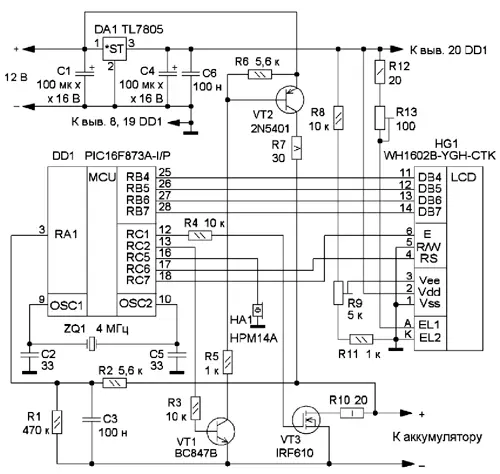 Схема устройства показана на рис. 1. Оно собрано на микроконтроллере DD1 PIC16F873A [1] и двухстрочном ЖКИ-модуле HG1 [2], по 16 символов в каждом. Конденсаторы С1, С4, С6 - блокировочные по цепи питания. Тактовую частоту микроконтроллера задают кварцевый резонатор ZQ1 и конденсаторы С2, С5. На резисторах R12 и R13 собран регулятор яркости подсветки ЖКИ. На резисторах R8, R9, R11 собран регулятор контрастности изображения ЖКИ. Резисторы R1, R2 и конденсатор С3 образуют делитель напряжения аккумулятора. Эта цепь подключена к входу АЦП микроконтроллера. Резисторы R3, R5-R7 и транзисторы VT1 и VT2 образуют цепь зарядки аккумулятора, резистор R7 - токоограничивающий. Резистор R10 (нагрузочный) и транзистор VT3 образуют цепь разрядки аккумулятора.