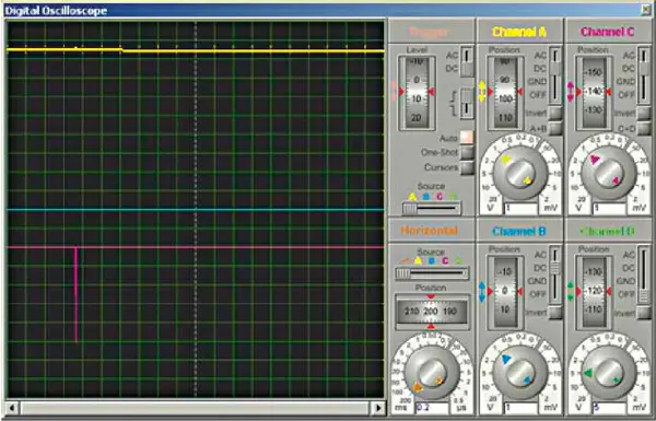 При подаче на устройство питающего напряжения на ЖКИ выводится сообщение "BATTERY TESTER (рис. 2). При подключении аккумулятора устройство определяет его наличие по остаточному напряжению и включает цикл зарядки и измерения (рис. 3). Далее происходит зарядка аккумулятора током около 300 мА. Причём она производится импульсами тока с малой скважностью (рис. 4). В паузах между импульсами микроконтроллер измеряет напряжение на аккумуляторе. На рис. 4 канал А (жёлтый) - напряжение на аккумуляторе, канал В (синий) - сигнал на линии RC2 микроконтроллера (управление цепью зарядки), канал С - сигнал на линии RC1 микроконтроллера (управление цепью разрядки, в данном случае напряжение сигнала равно нулю).