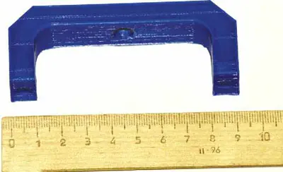 Здесь и далее размеры деталей рассчитаны на использование широко распространённых мультиметров серии DT83x. Автор испытывал держатель с приборами DT831 и DT832. В центральной части детали имеется углубление для размещения кольцеобразного неодимового магнита диаметром 10 мм и высотой 2 мм. Магнит крепится с помощью потайного винта М4х8 с гайкой, поэтому следует подобрать кольцеобразный магнит такой конфигурации, чтобы в центральное углубление помещалась потайная головка винта. При заявленных размерах детали может понадобиться немного уменьшить длину винта или заклеить его армированным скотчем так, чтобы он не царапал корпус мультиметра. С помощью пары винтов М4х35 с гайками к первой С-образной детали крепится планка из органического стекла размерами 90х34 мм. Толщина оргстекла, которое использовано для изготовления всех деталей, - 4 мм. Эта планка дополнительно защищает экран мультиметра от повреждений (рис. 2, рис. 3).