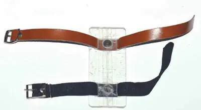 мешок от часов. Для крепления браслета в середине предплечья использован старый кожаный ремень шириной 15 мм. Ремень обрезан до подходящей длины так, чтобы его можно было один раз с небольшим запасом обернуть вокруг середины предплечья (рис. 10).