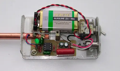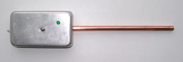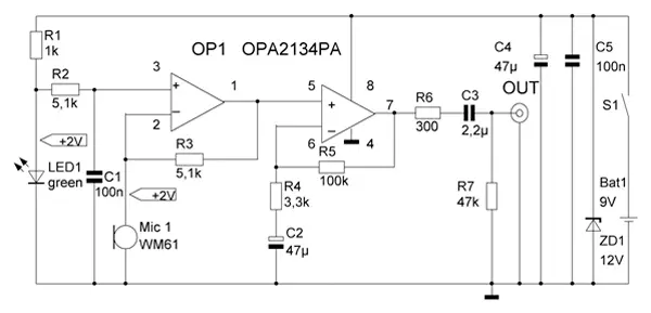 Изготовить своими руками такое устройство (рис. 2) совсем не сложно. Оно состоит из, помещенного в трубку, длиной 20 см, микрофонного капсюля диаметром 6 мм, микрофонного усилителя на ОУ ОРА2134, отличающимся высокими характеристиками [6], химического источника питания, напряжением 9 вольт, типа "Крона".