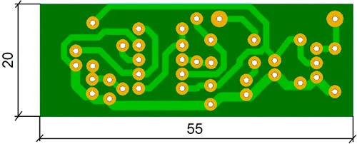 Печатная плата изготавливается из фольгированного стеклотекстолита размерами 55 х 20 мм - рис. 4. Проектирование и печать выполняется на ПК с использование программы Sprint Layout 6.0.