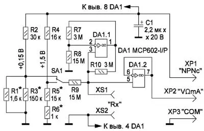 Схема доработанной приставки приведена на рис. 1. Доработка исходного варианта [1] коснулась введения переключателя пределов измерения SA1 и дополнительного резистивного делителя. Кроме того, удалён делитель на выходе ОУ DA1.2, что позволило более точно измерять сопротивление резисторов сопротивлением меньше 2 МОм, о чём будет сказано ниже.