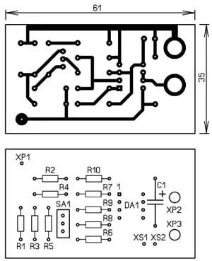 Чертёж платы показан на рис. 2. Элементная база приставки осталась прежней. Резисторы R7, R10и R8, R9 для уменьшения погрешности измерения следует подобрать парами с разбросом не более 1 % (чем меньше, тем лучше). Отклонение от номинального значения в парах на точность измерений не влияет. Переключатель SA1 - движковый SS12D07 или аналогичный малогабаритный. Резисторы R8, R9 можно применить с более доступным номиналом сопротивления 10 МОм, a R7, R10 - 2 МОм. В этом случае необходимо изменить и номиналы резисторов: R1 - 1,1 кОм; R3 - 18 кОм; R4 -20 кОм; R5 -9,1 кОм^6 - 910 Ом. При этом напряжения на делителях, задающие ток измерения у ИТ, будут соответственно 0,1 и 1В. После монтажа плату следует тщательно очистить спиртом от флюса.
