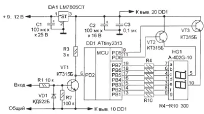 Схема измерителя показана на рисунке. Основа устройства - микроконтроллер ATtiny2313, работающий по программе, коды которой приведены в табл. 1. Он производит все необходимые вычисления и выводит информацию на светодиодный двухразрядный индикатор в режиме динамической индикации. Поскольку долговременной стабильности тактового генератора микроконтроллера не требуется, использован встроенный RC-генератор, работающий на частоте 8 МГц, что упрощает схему устройства. На транзисторе VT1 собран узел согласования уровней входного сигнала с логическими уровнями микроконтроллера, что необходимо при измерении сигналов с различной амплитудой. Диод VD1 защищает эмиттерный переход транзистора VT1 от пробоя при подаче на вход переменного или импульсного сигнала минусовой полярности. Напряжение питания микроконтроллера стабилизовано микросхемным стабилизатором DA1.