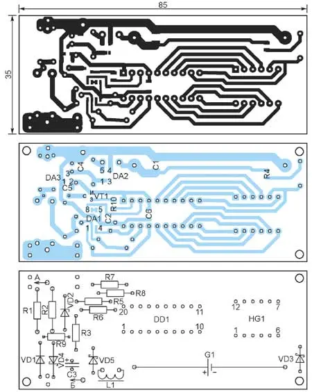Все детали миллиомметра, включая элемент питания, размещены на печатной плате размерами 35x85 мм из фольгированного с одной стороны стеклотекстолита. Чертёж её печатных проводников и монтажная схема изображены на рис. 2. Применены компоненты, как в обычном исполнении, так и для поверхностного монтажа. Для установки микроконтроллера предусмотрена панель, а для элемента питания - держатель.