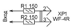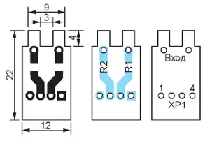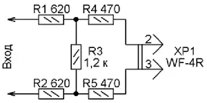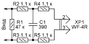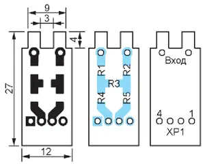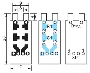 Если амплитуда измеряемого сигнала слишком велика, уменьшить её можно с помощью аттенюатора, собранного по схеме, показанной на рис. 11 . Его печатная плата изображена на рис. 12. При низком внутреннем сопротивлении источника он ослабляет сигнал приблизительно в два раза. Входное сопротивление аттенюатора - около 2,5 кОм.