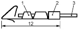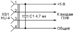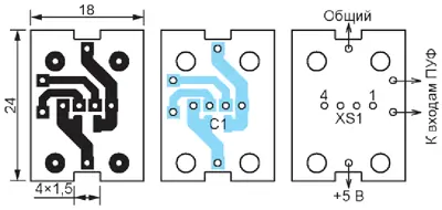 Схема платы с входным разъёмом показана на рис. 2, а её чертёж - на рис. 3. Перед установкой на эту плату разъёма XS1 его контактные пружины (они поставляются отдельно от корпуса) доработаны согласно рис. 4. В каждую из пружин 1 заделан отрезок одножильного неизолированного провода 3 длиной около 20 мм. На этот провод надет и придвинут вплотную к хвостовику пружины отрезок медной или жёсткой пластмассовой трубки 2. Общая длина пружины и отрезка трубки равна 12 мм. Только после этого контакты вставлены в корпус.
