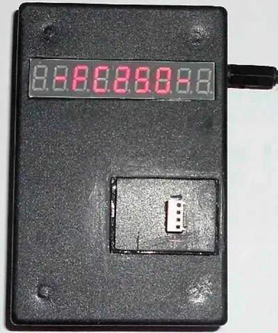 Разъём XS1 выведен на переднюю панель частотомера (рис. 6), для чего в корпусе прибора сделан вырез. Ещё один вырез предназначен для светодиодного индикатора и закрыт органическим стеклом. С правой стороны находится разъём питания.
