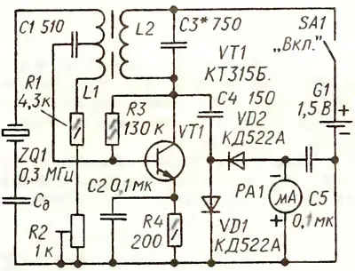 Выходное напряжение измерительного моста через конденсатор С1 подведено к базе усилительного транзистора VT1. Обмотка L2 вместе с конденсатором СЗ образуют параллельный колебательный контур, который нужно настроить на частоту последовательного резонанса кварцевого резонатора 300 кГц подборкой конденсатора СЗ На этой частоте контур имеет максимальное сопротивление, обеспечивая максимальный коэффициент усиления транзистора VT1 и благоприятствуя возбуждению колебаний на основной частоте кварцевого резонатора.