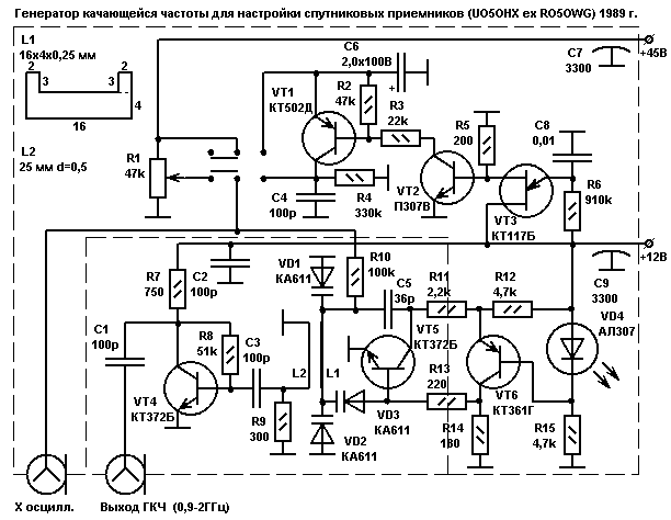 В генераторном ядре этой приставки испольуется схема гетеродина инженера Matjaz Vidmar YT3MV (ex YU3UMV) 1986 г. При подключении выхода пилы на вход Х осциллографа, а выхода в.ч. (через внешний аттенюатор) к входу спутникового приемника, можно наблюдать частотную характеристику его входных цепей и производить их настройку. Для входа Y осциллографа необходима с.в.ч. детекторная головка. Пересторйку частоты можно производить и вручную потенциометром R1. Уровень в.ч. на выходе около 0,5 вольт в диапазоне 0,9-2 ГГц. Особо хочу отметить, что паять с.в.ч. варикапы необходимо легкоплавким припоем, быстро и без ошибок, т.к. после повторной распайки их коэффициент перекрытия по емкости неизбежно падает. Вероятно это связанно с деградацией полупроводника при повышенной температуре.