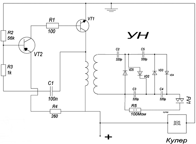 Умножитель напряжения можно взять в том же телевизоре, но, если его нет или он неисправен – можно собрать блок из деталей, обозначенных на схеме (используются высоковольтные диоды, такие как 7ГЕ350АФ или аналоги, работающие с напряжениями свыше 8 кВ, и конденсаторы – до 20 кВ).