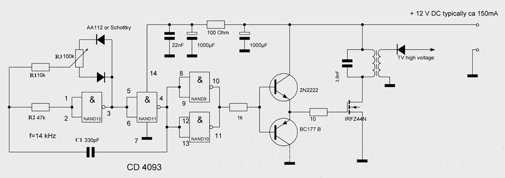 В качестве трансформатора в схеме был использован ТВС-110ПЦ15, но последний может быть с легкостью заменен на любой другой строчник из советского телевизора.
