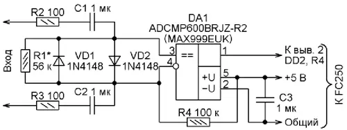 В описываемых ПУФ применены КМОП-компараторы МАХ999ЕиКили ADCMP600BRJZ-R2 в корпусе SOT-23-5 с одним выходом сигнала уровня ТТЛ и ADCMP604BKSZ-R2 в корпусе SOT-323-6 с двумя противофазными выходами стандарта LVDS [2]. С такими ПУФ частотомер на базе набора FC250 способен измерять частоту сигналов от 50 Гц до 110...250 МГц при их минимальной амплитуде 0,25...0,65 В. От дополнительных усилителей на входе компараторов пришлось отказаться. Они приводили к самовозбуждению, меры борьбы с которым ещё больше снижали чувствительность.