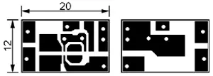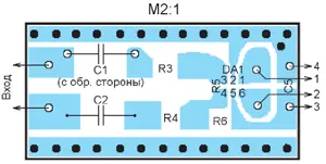 Для рассмотренного ПУФ разработаны два варианта печатной платы. Обе они изготовлены из фольгированного с двух сторон стеклотекстолита толщиной 1...1,5 мм методом прорезания фольги и механического удаления её лишних участков. Одна из плат (рис. 2,а) рассчитана на установку выводных диодов и резисторов мощностью 0,0б2 Вт. Конденсаторы могут быть для поверхностного монтажа или дисковыми выводными. Расположение элементов на этой плате показано на рис. 3. Плата меньших размеров, изображённая на рис. 2,б, рассчитана на элементы для поверхностного монтажа, в том числе на диоды 1N4148W. Расположение элементов - на рис. 4.