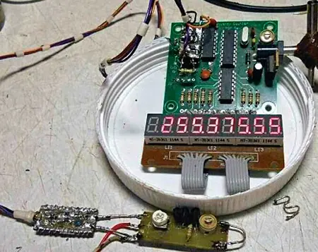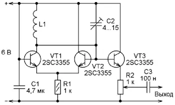 При проверке частотомера с описанными ПУФ в качестве источника сигнала использовался генератор, собранный по схеме, изображённой на рис. 11. Катушка L1 в нём сменная. Она бескаркасная с числом витков, подбираемым в зависимости от необходимого диапазона перестройки генератора.