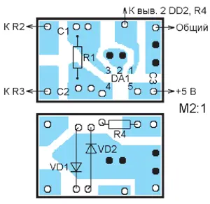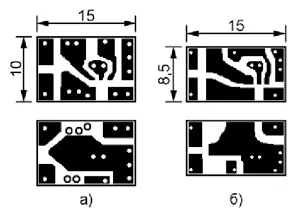 Переходные отверстия, соединяющие печатные проводники на противоположных сторонах плат, в обоих случаях показаны залитыми. Резисторы R1 и R2 - выводные мощностью 0,125 Вт. Их вставляют одним выводом в соответствующие отверстия плат и припаивают к фольге. К свободным выводам резисторов припаивают отрезки гибких изолированных проводов длиной 15 см со щупами.