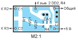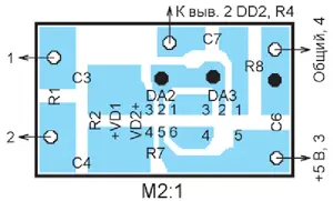 Впаянные в отверстия плат отрезки жёсткого провода, предназначенные для соединения ПУФ с частотомером, служат одновременно стойками для крепления платы ПУФ на плате частотомера.