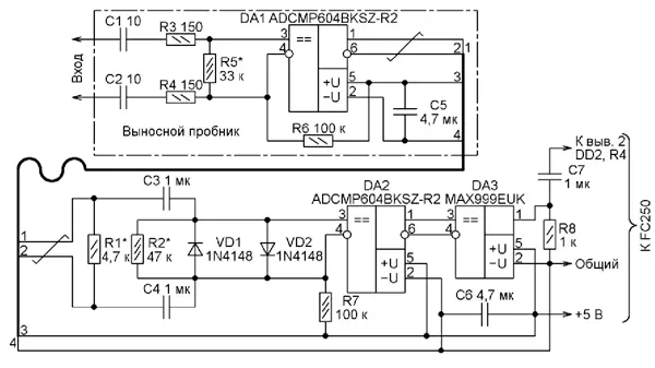 На рис. 5 приведена схема ПУФ с выносным пробником, собранного на трёх компараторах, соединённых последовательно. В пробнике и на входе собственно ПУФ применены компараторы ADCMP604BKSZ-R2 [5]. При выходах компаратора DA2, соединённых